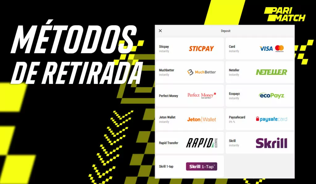 Os usuários do Parimatch podem sacar dinheiro de suas contas por vários métodos, diferindo em velocidade, conveniência, limites e taxas. A conta ou carteira para a qual o pagamento será transferido deve ser registrada no nome do usuário especificado no perfil do jogador.